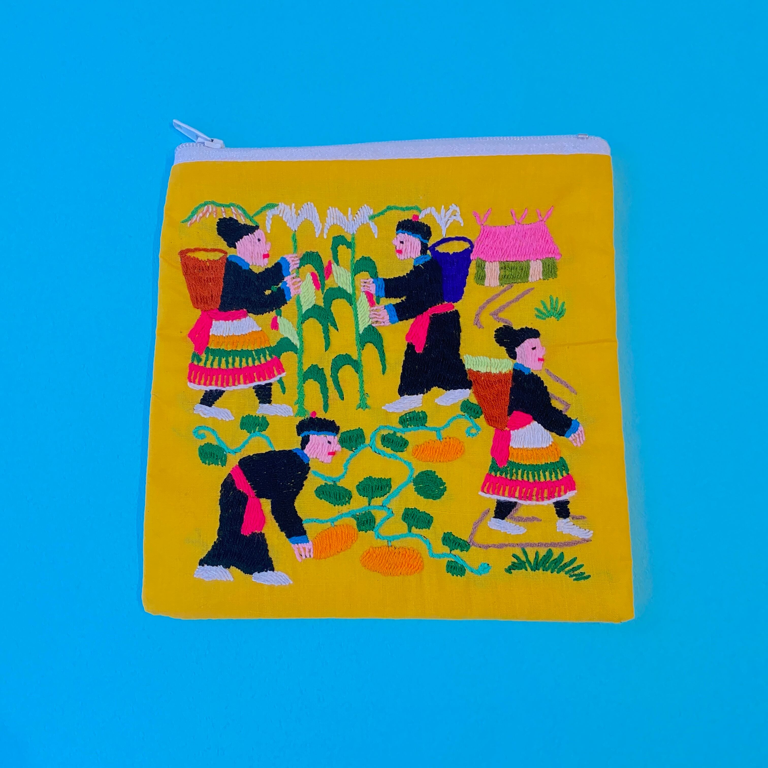暮らしを刺繍に表現した、配色も素晴らしいポーチです。 丁寧なしごとを感じていただけます。 サイズ:約14cm×14cm