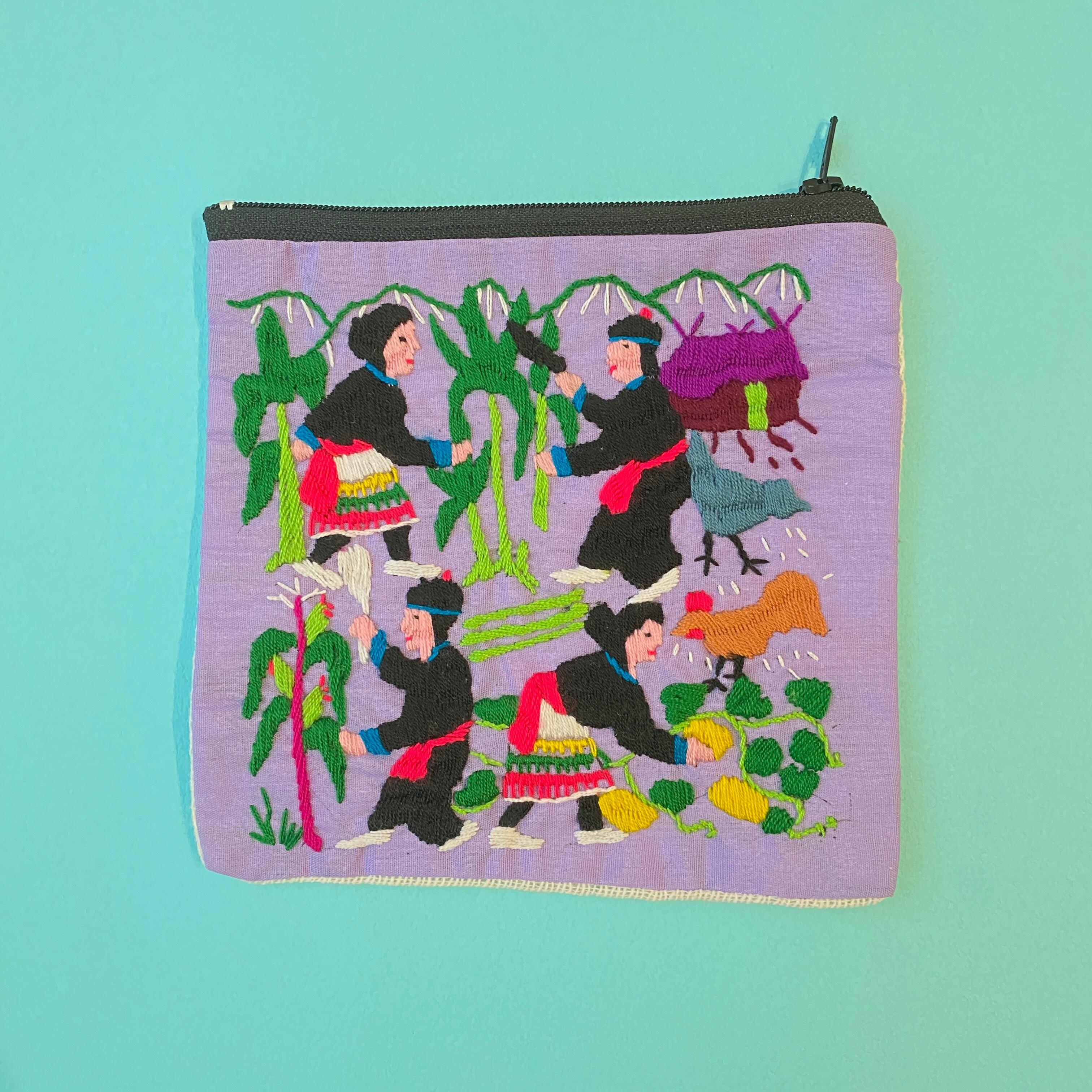 暮らしを刺繍に表現した、配色も素晴らしいポーチです。 丁寧なしごとを感じていただけます。 サイズ:約14cm×14cm