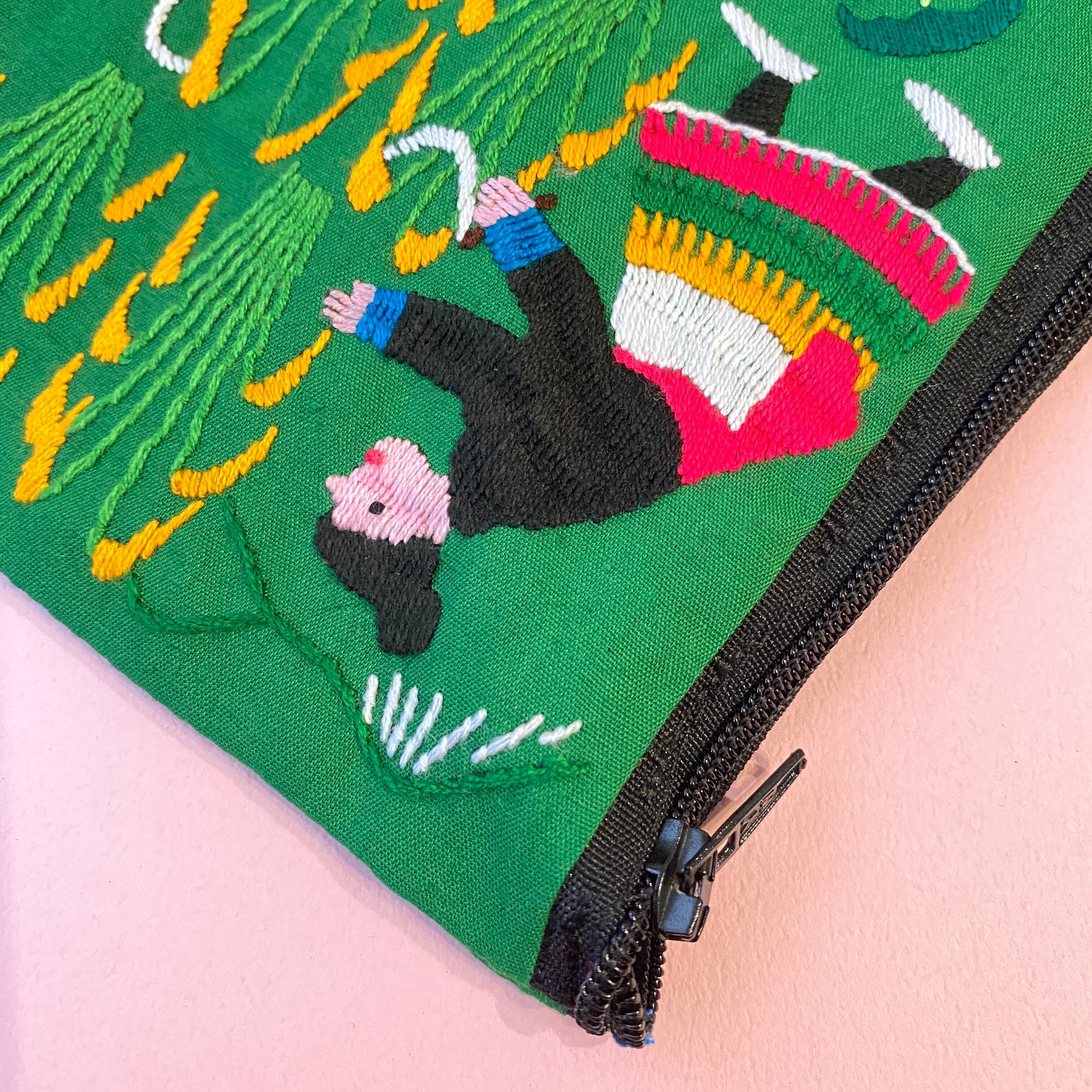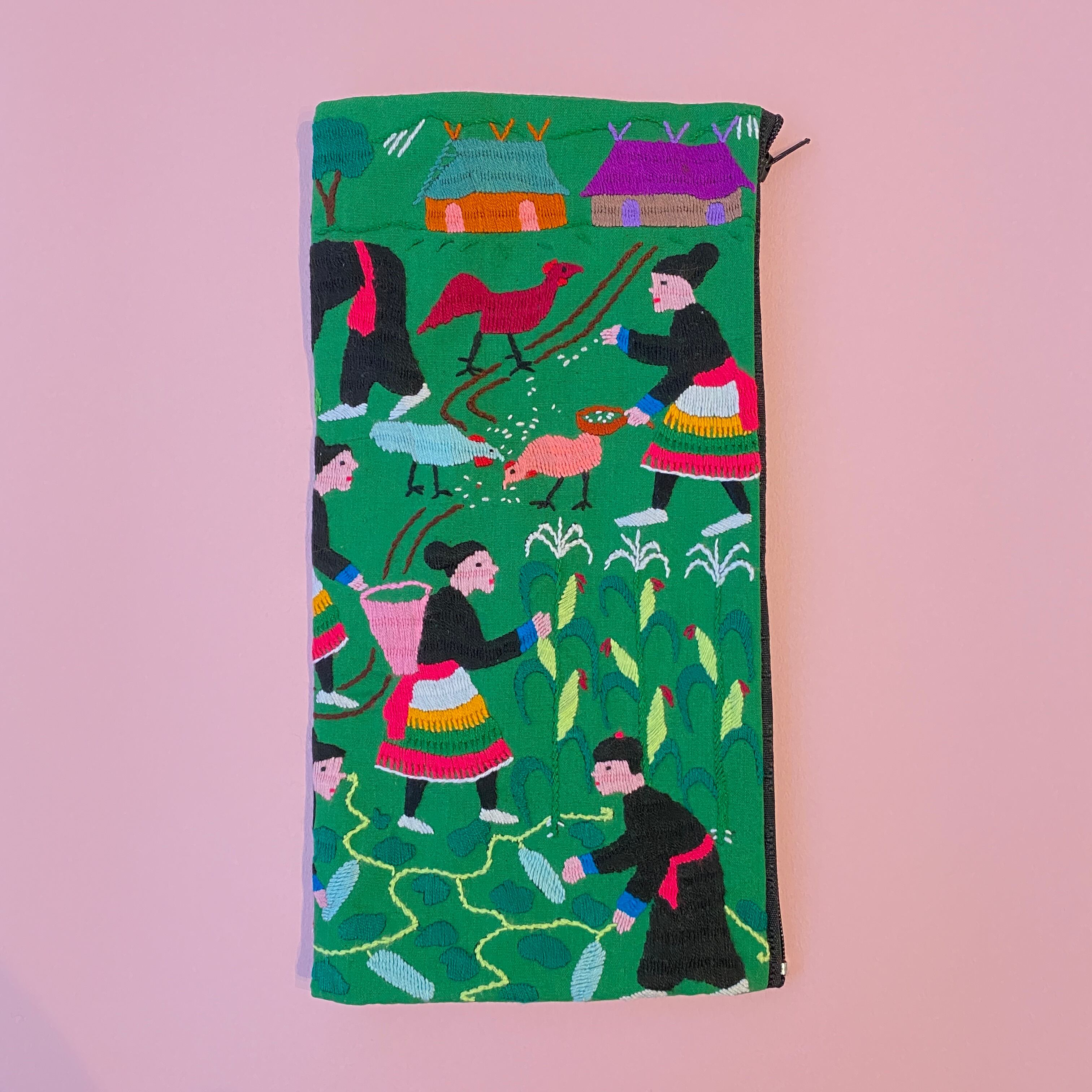 暮らしを刺繍に表現した、配色も素晴らしいポーチです。 丁寧なしごとを感じていただけます。 サイズ:約23.5cm×11.5cm