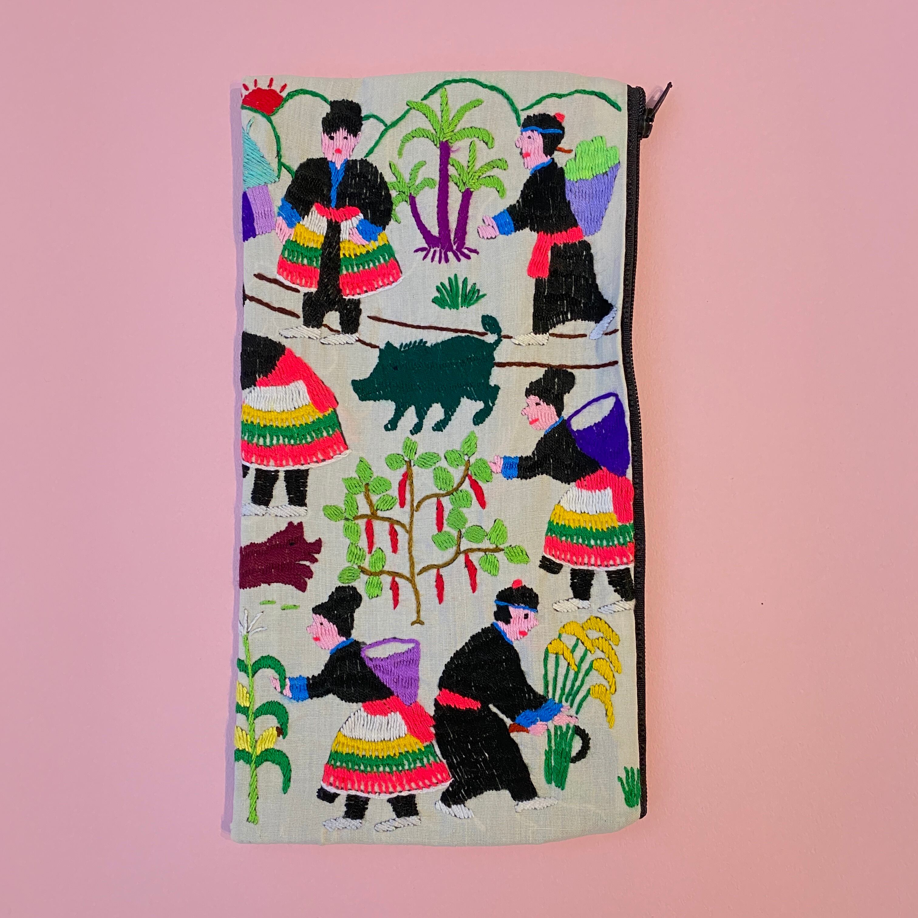 暮らしを刺繍に表現した、配色も素晴らしいポーチです。 丁寧なしごとを感じていただけます。 サイズ:約23.5cm×11.5cm