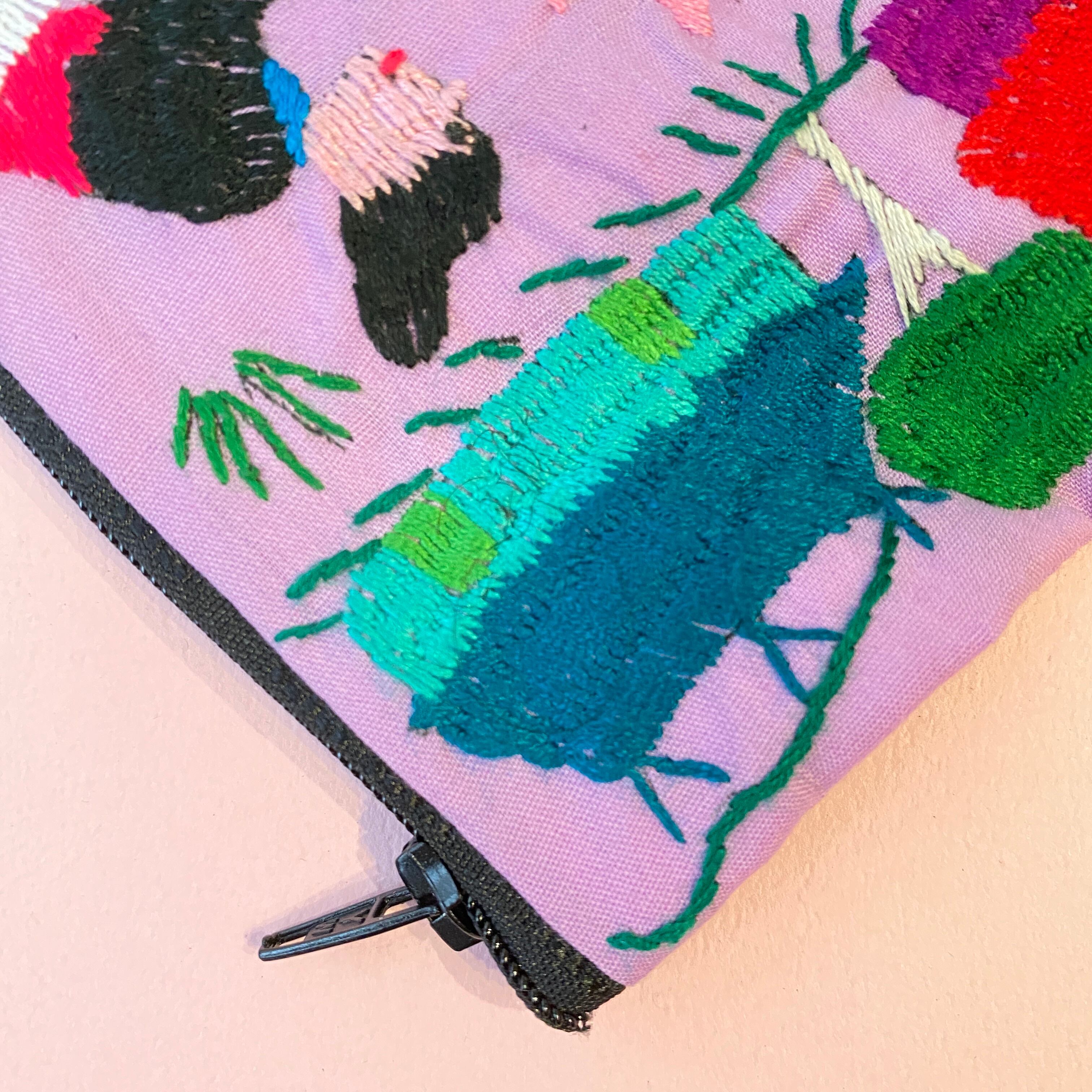 暮らしを刺繍に表現した、配色も素晴らしいポーチです。 丁寧なしごとを感じていただけます。 サイズ:約23.5cm×11.5cm